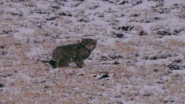 在玉树藏族自治州曲麻莱县叶格乡后山:大雪中的兔狲,这也是我人生第一次拍到!当时师傅车还没停稳我就急忙下车了。以后一定要注意安全,不能这么急躁,但是我太激动了。可惜的是大雪纷飞,我拍照技术不佳,拍糊了,哈哈。