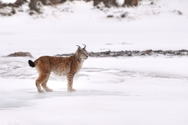 在曲麻莱县旧址往秋智乡的途中,幸运的我又拍到了人生第一只猞猁!这次我和李斌师弟慢慢下车,趴在路边的栏杆上,记录下了猞猁雄姿英发的一瞬间。