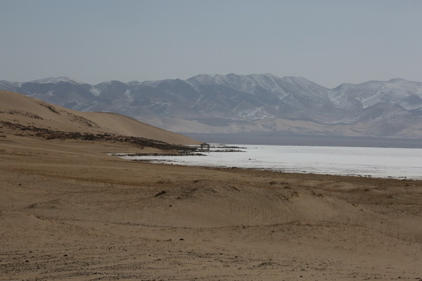 靠近沙岛附近,湖边一半雪山一半沙漠的生境还是挺少见的,我印象中的青海湖并没有沙漠。沙岛景区里面的生态恢复工作做的很到位,自从实行禁止人进出的政策以来,生态环境逐渐在恢复,野生动物的数量也在慢慢增加。3月份青海湖还处于冰封的状态,站在湖边,一望无垠的冰面连着雪山,宛若一块巨大的晶莹剔透的宝石镶嵌在山的环抱中。经验告诉我们,野生动物和家养的牲畜总是分开的,只要是看见有家畜,就没有野生动物。在元者村、湖东种羊场、尕海和克图,放牧活动比较频繁,藏野驴调查并没有想象中的顺利,加上地形原因和牧民草场的客观因素,只是见到了为数不多的普氏原羚,鸟兽也少的可伶,不知道是因为天气原因还是人类活动太频繁,鸟兽样方几乎都是几条空样线。