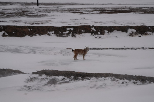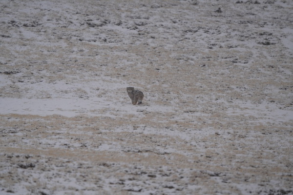 出了可可西里,身体仿佛一下就轻了许多,外面的氧气要比里面充足。从五道梁出发,经过曲玛河乡,去曲麻莱的路上拍到了兔狲。在雪中的兔狲乍一看就像是一只猫,镜头拉近,兔狲远远的注视着我们,这些多天来可算是见到了比较新奇的物种。以前出野外的时候就听课题组的师兄师姐说曲麻莱是物种丰富度比较高的地方,果然在第二天的时候又见到了猞猁。我和钟哥是在徐波师兄和李斌师兄拍完之后又一次去找的猞猁,按照钟哥的说法,在曲麻莱这种生境,每见到10只大鵟就有可能出现一只藏狐,每见到10只藏狐就有可能出现猞猁,在这儿的猞猁专吃藏狐和藏原羚,而在天俊地区的猞猁专吃鼠兔和藏狐。为了拍到那只猞猁,我们开车进去了满是雪的山沟里面,爬到山坡上发现了那只拟态的猞猁,终于是苦心人天不负,如愿以偿。