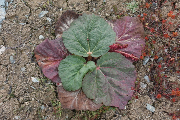矮壮草本,无茎,根状茎顶端具多层托叶鞘,棕褐色,干后膜质或纸质,光滑无毛。叶基生,2-4片,叶片革质,宽卵形或菱状宽卵形,长10-20厘米,宽9-17厘米,顶端圆钝,基部近心形,全缘,有时成极弱波状,基出脉5-7条,叶上面黄绿色,下面紫红色,两面光滑无毛或下面具小乳突;叶柄粗壮,半圆柱状,长4-10厘米,常紫红色,光滑无毛或粗糙。花葶2-3枝,自根状茎顶端抽出,与叶近等长或短于叶,每支成2-4歧状分枝,下部直径5-7毫米,光滑无毛或有时具稀疏乳突,花序为穗状的总状;花黄白色,花梗长约2毫米,关节在下部;花被不开展,花被片宽卵形或卵形,外轮较小,长约1.2毫米,内轮较大,长约1.5毫米,宽约1.3毫米;雄蕊9, 与花被近等长或稍外露,花丝基部与花盘合生;子房宽椭圆形,花柱长,向下反曲,柱头膨大成盘状,表面不平。果实宽卵形或梯状卵形,长8.5-10毫米,宽7-8.5毫米,顶端圆,有时微凹或微凸,基部略呈心形,翅宽约3毫米,纵脉在翅的中部偏外缘。种子卵形,宽约3毫米,深褐色。花期7月,果期8月。