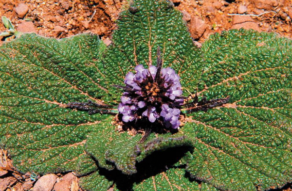 无茎多年生草本,高2.5-10cm。根茎伸长,粗厚,径达1cm。叶片常4枚,辐状两两相对,菱状圆形、菱形、扇形、横肾形以至三角形,长4-13cm, 宽4.4-l2cm,先端钝、圆形或急尖,基部浅心形或宽楔形,下延至叶柄,边缘具圆齿,上面绿色,密被白色疏柔毛,具皱,下面较淡,仅沿脉上疏被短柔毛,侧脉3-5对,在叶片中部以下生出,其上再一侧分枝,因而呈扇形,与中肋均两面凸起;下部叶柄伸长,长可达8cm,上部者变短,几至无柄,密被短柔毛。轮伞花序密集排列成有短葶的头状或短穗状花序,有时下部具分枝而呈短圆锥状,长3.5-7cm,序轴密被短柔毛,苞片披针形、倒披针形或线形,长1-4cm,宽1.5 -6mm,下部者最大,向上渐小,先端渐尖,基部下延,全缘,具缘毛,上面被疏柔毛,小苞片针刺状,长约8mm,宽约0.5m m。花雩管状,长约10m m,宽约2.5m m,干时带紫褐色,外面沿脉上被疏柔毛,萼齿5,短三角形,先端具长约2mm 的刺尖,自内面被丛毛。花冠长约1.2cm,外被微柔毛,内面在冠筒中部密被微柔毛,冠筒管状,基部宽约1.25mm,向上近等宽,至喉部略增大,宽达2mm,冠檐二唇形,上唇近圆形,直径约5mm,边缘具齿牙,自内面密被柔毛,下唇外面除边缘全缘外被微柔毛,内面在中裂片中部被髯毛,余部无毛,3裂,裂片椭圆形,长约4mm,宽约3mm,侧裂片较小,长约2.5mm,宽约2mm。花期6-7月,果期8-9月。