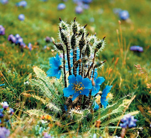 一年生草本, 全体被黄褐色或淡黄色、坚硬而平展的刺,刺长0.5-1cm。主根肥厚而延长,圆柱形,长达20cm或更多,上部粗1-1.5cm,果时达2cm。叶全部基生,叶片披针形,长5-12cm,宽约1cm,先端钝或急尖,基部渐狭而入叶柄, 边缘全缘或波状,两面被黄褐色或淡黄色平展的刺;叶柄长0.5-3cm。花葶5-12或更多,长10-20cm,坚硬,绿色或蓝灰色,密被黄褐色平展的刺,有时花葶基部合生。花单生于花葶上,半下垂,直径2.5-4cm;花芽近球形,直径约1cm或更大;萼片外面被刺;花瓣5-8,有时4,宽倒卵形,长1.2-2cm,宽约1cm,蓝紫色;花丝丝状,长约1cm,色比花瓣深,花药长圆形,稍旋扭;子房圆锥状,被黄褐色平伸或斜展的刺,花柱长6-7mm,柱头圆锥状。蒴果倒卵形或椭圆状长圆形,稀宽卵形,长1.2-2.5cm,被锈色或黄褐色、平展或反曲的刺,刺基部增粗,通常3-5瓣自顶端开裂至全长的1/3-1/4。种子肾形,种皮具窗格状网纹。花果期6-9月。
