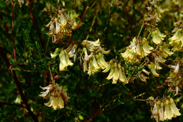 多年生草本,高50-100cm。主根肥厚,木质,常分枝,灰白色。茎直立,上部多分枝,有细棱,被白色柔毛。羽状复叶有13-27片小叶,长5-10cm;叶柄长0.5-1cm;托叶离生,卵形,披针形或线状披针形,长4-10mm,下面被白色柔毛或近无毛;小叶椭圆形或长圆状卵形,长7-30mm,宽3-12mm,先端钝圆或微凹,具小尖头或不明显,基部圆形,上面绿色,近无毛,下面被伏贴白色柔毛。总状花序稍密,有10-20朵花;总花梗与叶近等长或较长,至果期显著伸长;苞片线状披针形,长2-5mm,背面被白色柔毛;花梗长3-4mm,连同花序轴稍密被棕色或黑色柔毛;小苞片2;花萼钟状,长5-7mm,外面被白色或黑色柔毛,有时萼筒近于无毛,仅萼齿有毛,萼齿短,三角形至钻形,长仅为萼筒的1/4-1/5;花冠黄色或淡黄色,旗瓣倒卵形,长12-20mm,顶端微凹,基部具短瓣柄,翼瓣较旗瓣稍短,瓣片长圆形,基部具短耳,瓣柄较瓣片长约1.5倍,龙骨瓣与翼瓣近等长,瓣片半卵形,瓣柄较瓣片稍长;子房有柄,被细柔毛。荚果薄膜质,稍膨胀,半椭圆形,长20-30mm,宽8-12mm,顶端具刺尖,两面被白色或黑色细短柔毛,果颈超出萼外;种子3-8颗。花期6-8月,果期7-9月。