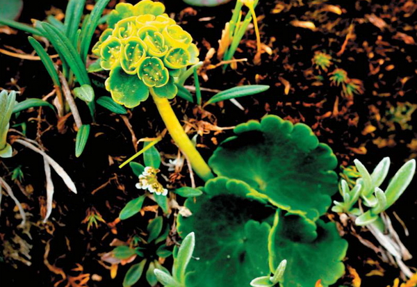 多年生草本,高4.5-10cm。茎疏生褐色柔毛或乳头突起,通常无叶。基生叶具长柄,叶片革质,肾形,长约9mm,宽约13mm,边缘具(7-)11-15浅齿(齿扁圆形,长约3mm,宽约4mm,先端凹陷且具1疣点,通常相互叠结,两面无毛,齿间弯缺处具褐色柔毛或乳头突起;叶柄长1-7.5cm,下部疏生褐色柔毛。聚伞花序密集呈半球形,长约1.1厘米;苞叶革质,阔卵形至扇形,长3-6.8mm,宽2.8-8.1mm,具3-9浅齿(齿扁圆形,先端通常具1疣点,多少叠接),腹面具极少褐色柔毛,背面无毛,齿间弯缺处具褐色柔毛,柄长1-3mm,疏生褐色柔毛;托杯外面疏生褐色柔毛;萼片在花期直立,相互多少叠接,扁圆形,长1.8-2mm,宽3-3.5mm,先端钝圆,弯缺处具褐色柔毛和乳头突起;雄蕊8,长约1.1mm;两心皮近等大,子房半下位,花柱长0.6-0.8mm,斜上。蒴果先端凹缺,长约3.4mm,2果瓣近等大,喙长约0.7mm;种子黑褐色,卵球形,长1.3-1.6mm,光滑无毛,有光泽。花果期6-8月。