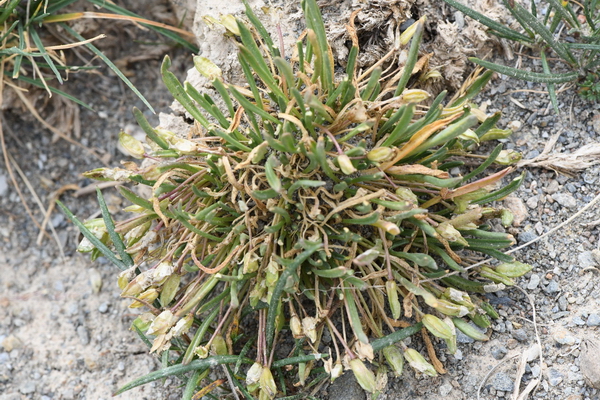 多年生矮小丛生高山草本,高5-15cm。植株光滑无毛;根粗壮,表面常皱缩,并具环纹,侧根少数纤维状;茎极短缩。叶多数,旋叠状着生于基部,叶片线状披针形或长匙形,长3-10cm,宽5-8mm,全缘或具疏浅齿;叶柄扁平,于基部扩大呈鞘状;花大,单生于由茎基丛出的扁平带状的花葶上,常略短于叶;萼片4,长卵形,长3-5mm,宽2-3mm,内轮2枚,基部略呈囊状,具有白色膜质边缘;花瓣2,倒卵形,长5-8mm,宽3-7mm,顶端全缘或微凹,基部稍具爪;雄蕊6,近等长;雌蕊1,由2心皮组成,子房椭圆形,长3-3.5mm,宽约2.5mm;花柱细柱形,柱头不显。短角果宽卵形,长4-5mm,宽3-3,5mm,扁平,肉质,不开裂,边缘具狭翅。种子每室2行,扁圆形,褐色。花果期6-9月。