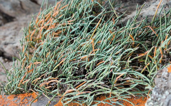 草本状灌木,高20-40cm;木质茎短或成匍匐状,小枝直伸或微曲,表面细纵槽纹常不明显,节间长2.5-5.5cm,多为3-4cm,径约2mm。叶2裂,鞘占全长1/3-2/3,裂片锐三角形,先端急尖。雄球花多成复穗状,常具总梗,苞片通常4对,雄蕊7-8,花丝合生,稀先端稍分离;雌球花单生,在幼枝上顶生,在老枝上腋生,常在成熟过程中基部有梗抽出,使雌球花呈侧枝顶生状,卵圆形或矩圆状卵圆形,苞片4对,下部3对合生部分占1/4-1/3,最上一对合生部分达1/2以上。雌花2,胚珠的珠被管长l毫米或稍长,直立或先端微弯,管口隙裂窄长,约占全长的1/4-1/2,裂口边缘不整齐,常被少数毛茸。