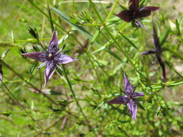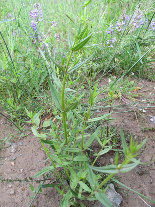 一年生草本,高15-60cm。主根淡黄色,茎四棱形,棱上有窄翅,植株呈塔形或帚状分布,枝斜展,叶对生;无柄;叶片卵状披针形至狭披针形,长8-35mm,宽3-10mm,先端钝,基部略呈心形,半抱茎;下面中脉明显突起。圆锥状复聚伞花序,具多花;花梗直立或斜伸,长可达5cm;花萼绿色,4裂,裂片线状披针,先端急尖。背面具明显的3脉;花冠暗紫红色,直径8-13mm,4裂,裂片披针状,长79mm,先端渐尖,具尖头,基部具2个沟状的腺窝。狭长圆形,深陷,边缘具柔毛状流苏;子房长圆状,无柄,花柱粗短,柱头2裂,裂片半圆形。蒴果长圆状披针形,长8-14mm,先端尖;种子椭圆形,深褐色,表面有网状突起。花、果期7-10月。