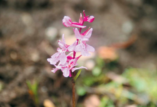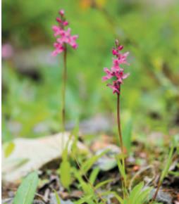 地生兰,植株高12-30cm。块茎长圆形或圆球形,肉质,不裂。茎直立,圆柱状。叶片长圆状披针形、披针形或线状披针形至线形,上面无紫色斑点。花序具1-20余朵花,多偏向一侧;花紫红色或粉红色;花瓣直立,斜狭卵形、宽卵形或狭卵状长圆形,长5-7mm,宽3-4mm,先端钝,边缘无睫毛,前侧近基部边缘稍臌出或明显臌出,具3脉;唇瓣向前伸展,较萼片长和宽多,边缘无睫毛,3裂。花果期6-9月。