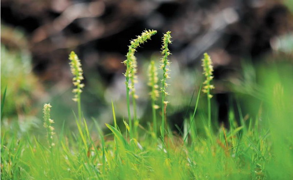 地生兰。高6-30cm。块茎圆球形,直径8-15mm。茎直立,下部具2-3枚叶。叶椭圆形或椭圆状披针形,长3-7cm,宽1-2.5cm,端急尖,基部渐狭抱茎。总状花序长5-19cm,具多数花;花苞片线状披针形,端渐尖,下部的与子房等长;花小,黄绿色,垂头;中萼片狭卵形,长约3mm,宽约1.3mm,端钝;侧萼片斜披针形,较中薄片稍长而狭,端稍尖;花瓣狭菱状披针形,长约5mm,下部1/3处宽约1.2mm,且骤狭为线状披针形,肉质增厚,端钝尖;唇瓣长约4mm,近基部宽约1.2mm,下部1/4处三裂,中裂片线形,肉质增厚,长约3mm,侧裂片三角形,稍叉开,较中裂片短很多,唇瓣基部凹陷呈浅囊;柱头2;子房圆柱形,长5-6mm,扭转,无毛。花期7-8月,果期9月。