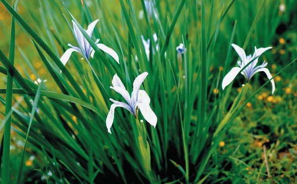 多年生草本,高15-40cm,基部残存纤维状的老叶叶鞘,呈棕褐色。根茎粗壮,下生坚韧细根。叶全部基生,成丛,叶片条形,微扭转,长20-40cm,宽3-6mm,先端渐尖,全缘,淡绿色,平行脉两面凸起,7-10条。花大,蓝色,1-3朵,直径约6cm;花被6,外轮3片匙形,长约4.5cm,中部有黄色纹,向外展开而下垂,内轮3片直立,倒披针形,长5-6cm;雄蕊3枚,紧靠于弯曲的花柱外侧,花药长,向外反卷,纵裂;子房下位;花柱3,扁平,柱头2裂,蓝色,花瓣状。蒴果纺锤形,淡绿色有3棱,长6-7cm,顶端呈小嘴状。种子多数,红褐色,为不规则的圆形,有棱。花果期5-9月。