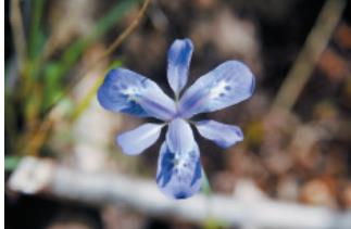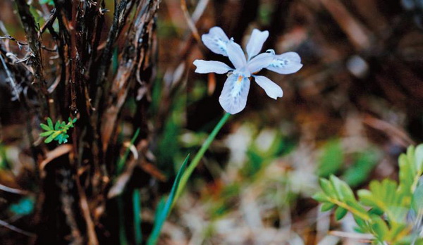 多年生草本。基部宿存纤维状枯叶鞘。须根多数,近肉质,黄白色。根状茎短,棕色。花茎伸出地面,高9-25cm,顶部具2枚苞片,苞片宽于营养叶,绿色,膜质,内含1花。叶基生,基部鞘状,互相套叠,直立,条形,长7-20cm,宽2-3mm。花直径3-5cm;花被片6,两轮排列,外轮裂片和内轮裂片不同形,蓝紫色,具深紫色斑点,平展或下弯,向轴面中脉具棒毛状附属物;内轮花被片3,直立;花被管管状,长约2cm;雄蕊3,花药黄色,条形;子房纺锤状,花柱柱头三裂,每裂片复二裂,花柱分枝花瓣状,蓝色。蒴果具喙,椭圆形;种子栗褐色,多面体形。花果期6-9月。