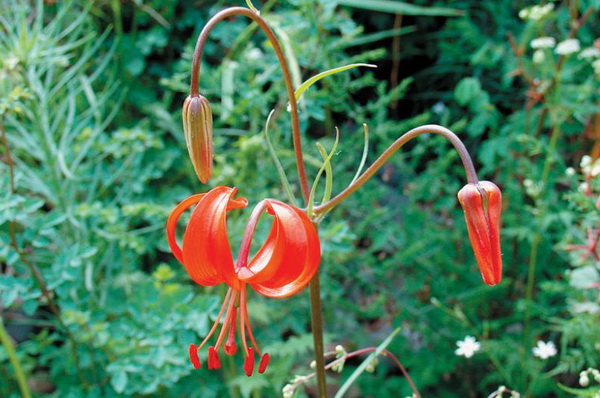 鳞茎卵形或圆锥形,高2.5-4.5cm,直径2-3cm;鳞片矩圆形或长卵形,长2-3.5cm,宽1-1.5cm,白色。茎高15-60cm,有小乳头状突起,有的带紫色条纹。叶散生于茎中部,条形,长3.5-9cm,宽1.5-3mm,中脉下面突出,边缘有乳头状突起。花单生或数朵排成总状花序,鲜红色,通常无斑点,有时有少数斑点,下垂;花被片反卷,长4-4.5cm,宽0.8-1.1cm,蜜腺两边有乳头状突起;花丝长1.2-2.5cm,无毛,花药长椭圆形,长约1cm,黄色,花粉近红色;子房圆柱形,长0.8-1cm;花柱稍长于子房或长1倍多,长1.2-1.6cm,柱头膨大,径5mm,3裂。蒴果矩圆形,长2cm,宽1.2-1.8cm。花期7-8月,果期9-10月。