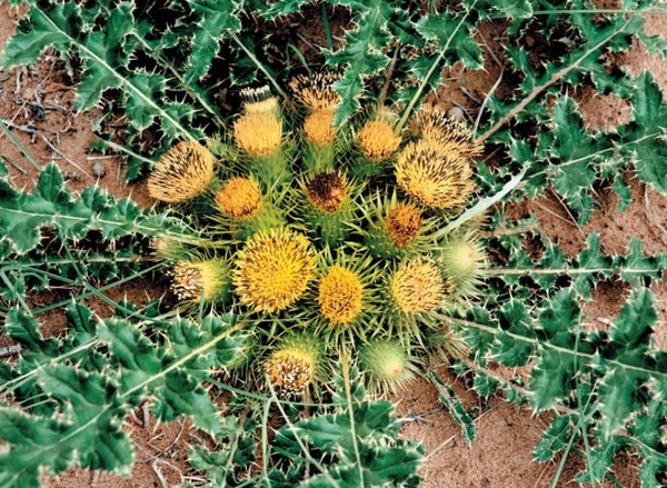 多年生草本,高5-7cm。根粗壮,圆柱形,直径1.5-2cm,颈部密被褐色枯叶柄。无茎或近无茎。叶基生呈莲座状,革质,叶片长圆形或长圆状披针形,长达30cm,宽2-8cm,羽状深裂,裂片三角形或三角状披针形,先端急尖成针刺,边缘具不规则的锯齿和针刺,上面绿色,无毛,下面密被灰白色蛛丝状毛,叶柄短,基部扩大,半抱根颈及花序柄,被绒毛或无毛。头状花序具短花序梗,从生叶丛中, 8-10或更多;总苞宽钟形,长3-6cm,宽达5cm,总苞片多层,近革质,不等长,外层长为内层的1/2,狭披针形,先端针刺状,常外反,内层披针形或线形,先端渐尖,全部总苞片背部被毛;小花管状,黄色,长3.5-3.7cm。瘦果光滑,具褐色斑点;冠毛多层,淡黄色,糙毛状,长约3cm。花果期7-9月。