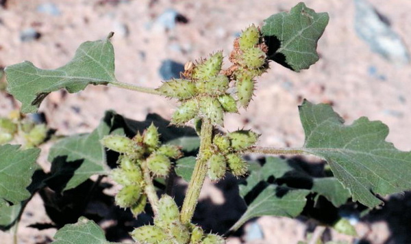 一年生草本,高30-50cm。茎直立,被短糙毛,常从基部分枝。叶片宽卵形或心形,长5-12cm,宽4-7cm,先端急尖,基部浅心形,边缘3-5浅裂或具不规则细齿,两面均粗糙,上面脉上及下面被糙毛,叶柄细长,被短毛。头状花序单性,雌雄同株;雄花序顶生,球形,径4-6mm;总苞片长圆披针形,分离,具多数不结实的两性花,花冠具5个宽裂片,雄蕊5;雌头状花序卵形,外层总苞片小,分离,被毛,内层合生成囊状,成熟时连同喙长8-10mm,外面具钩状刺和细毛,内有2个小花,雌花无花冠,花柱分枝线形,伸出坚硬的果喙外。瘦果2,包于总苞内。花果期7-9月。