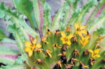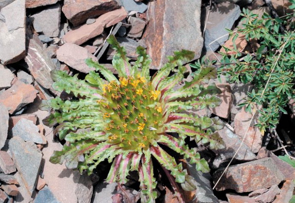 多年生草本,高2-6cm。根细长。茎极短或伸长,顶部膨大。叶基生,莲座状,倒披针形或匙形,连柄长2-6cm;叶片长至2.5cm,宽3-12mm,先端钝或急尖,边缘有细齿、羽状浅裂或近似大头羽状浅裂,稀近全缘,上面被浓密的白色柔毛至无毛;叶柄扁平,常紫红色。头状花序少数至多数,在莲座叶从中密集成半球形的复花序,其直径可达4cm;总苞圆柱形;总苞片5,长8-11mm,宽约2mm,先端钝,被毛或无毛,常为黑褐色;小花舌状,5个,黄色或淡黄白色,舌片长2-3mm,宽约1mm,管部长5-8mm。瘦果倒卵状长圆形,长约4mm,褐色,一面有1肋,另一面有2肋,边肋明显;冠毛与小花管部等长,上半部淡褐色,下半部白色。花果期8-9月。
