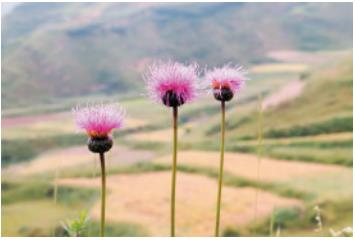 多年生草本,高40-80cm。根状茎细长。茎直立,不分枝或分枝,被疏的有节柔毛,基部被枯叶柄纤维。基生叶与茎下部叶椭圆形或倒披针形,长6.5-20cm,宽1.2-6cm,羽状浅裂至深裂,或具羽状大齿,裂片长圆形。披针形或三角形,长达2.5cm,宽0.4-1cm,全缘或边缘有齿;中部叶渐小,羽状浅裂或全缘;最上部常无叶;全部叶两面粗糙,疏被有节短柔毛。头状花序单生茎和枝端;总苞半球形,长2-2.5cm,宽2-3.5cm;总苞片多层,革质,紧密的覆瓦状排列,外层和中层卵形,长5-15mm,宽至6mm,先端急尖被绒毛,有小刺尖,内层线状披针形,长至2.5cm,先端渐尖;小花管状,紫红色,长2-2.5cm。瘦果扁压,有肋;冠毛褐色,多层,不等长,长约7mm。花果期7-8月。