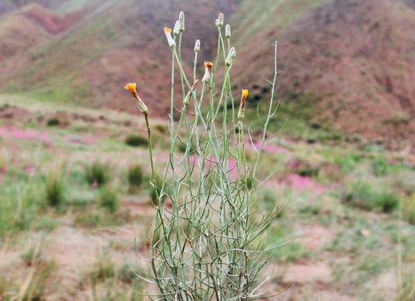 多年生草本,高10-50cm。主根粗,肉质,颈部被残茎和残叶鞘,后者常呈纤维状。茎发自根颈部,多数,丛生,灰绿,无毛或有毛,上部分枝,呈帚状。基生叶线状披针形,长至10cm,宽约2mm,基部扩大,鞘状,内面被毛;茎生叶线形,长至5cm,宽1-2mm,无毛或有毛;最上部叶细小,针刺状。头状花序单生枝端,在植株上部形成聚伞式伞状花序;总苞筒状,长1.5-2.5cm,径约0.8cm以下,总苞片5-7层,不等长,外层小,卵状三角形,长2-5mm,宽至3mm,被白色蛛丝状毛,内层线状长圆形,先端钝,常带紫红色。小花全部舌状,黄色,长达2cm,舌片先端平截。瘦果圆柱形,有瘤状突起;冠毛多层,羽状,长约1.5cm,淡黄色。花果期6-8月。