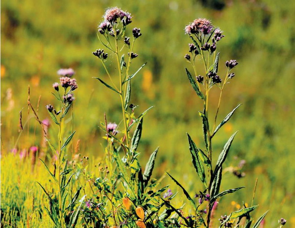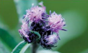多年生草本,高30- 60cm。具短的根状茎,茎直立;地上茎无毛。叶互生;条状长圆形,稀条状披针形,长3-10cm,宽1-2cm,先端长渐尖,基部渐狭成深心形的耳,半抱茎,边缘具长尖头的细密齿,上面被糙短毛,下面具腺体;上部叶较小,基部无明显的耳;全部叶均无叶柄。头状花序,多数,梗短,在茎端密集成伞房状;总苞卵形,长约10mm,外面被蛛丝状毛,总苞片上部及边缘黑色,除最内层外,全面在先端有长钻状的附片;管状小花粉紫色,长10-11mm。瘦果长3-4mm,冠毛污白色,外层糙毛状,内层羽毛状。花期8-9月。