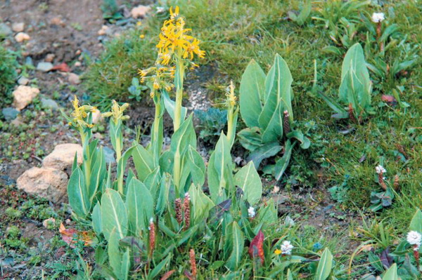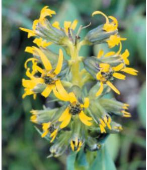 多年生灰绿色草本,高达60cm,茎直立,光滑,基部被褐色枯叶柄纤维包围。从生叶与茎基部叶具柄,柄长达21.5cm,具翅,叶片卵形,椭圆形或长圆状披针形,长3-15cm,宽1.3-7cm,先端钝或急尖,全缘,基部楔形或宽楔形,渐狭,下延成翅柄,两面光滑,叶脉羽状或近平行,基生叶小,卵形至线形,常筒状抱茎。总状花序长达22cm,密集或下部疏离,上部密集,苞片线状披针形至线形;头状花序多数,辐射状;总苞陀螺形或杯状,长7-10mm,宽6-9mm,总苞片10-14,长圆形或狭披针形,先端钝至渐尖,舌状花黄色,舌片线形,长至2cm,管状花黄色,长7-8mm。瘦果长约5mm,冠毛长7-8mm。花果期7-9月。
