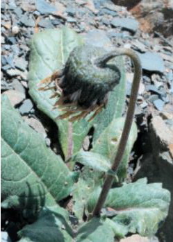 多年生草本,高5-20cm,具较长的地下茎,其上有鳞叶;地上茎直立,上部被白色和黑色有节长毛,下部光滑。无从生叶;茎下部叶具柄,柄2-14cm,光滑,叶片卵形、卵状长圆形或近圆形,长0.7-6cm,宽1-4cm,先端钝圆,全缘或具浅齿,上面光滑,下面被密的白色柔毛,叶脉羽状;茎上部叶渐小,卵形至线形。头状花序单生,下垂,辐射状;总苞半球形,长0.7-6cm,宽1-2cm,被黑色或白色有节长柔毛;总包片8-12,1层,基部合生成浅杯状,分离部分线状披针形,宽2-3mm;舌状花黄色,舌片椭圆形,长1-2cm,宽3-1mm;管状花长7-9mm,瘦果长3-4mm;冠毛长7-9mm,白色。花果期7-9月。