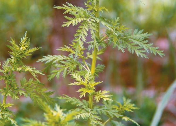 一年生草本,高达1.5m,全体近于无毛。茎直立,圆柱形,表面具有纵浅槽,幼时绿色,老时变为枯黄色;下部木质化,上部多分枝。茎叶互生;3回羽状细裂,裂片先端尖,上面绿色,下面黄绿色,叶轴两侧有狭翅,茎上部的叶,向上渐小,分裂更细。头状花序球形,下垂,排列成金字塔形、具有叶片的圆锥花序,几密布在全植物体上部;每一头状花序有短花柄,基部具有或不具有线形苞片;总苞平滑无毛,苞片2-3层,背面中央部分为绿色,边缘呈淡黄色,膜质状而透明;花托矩圆形,花均为管状花,黄色,外围为雌花,仅有雌蕊1枚;中央为两性花,花冠先端5裂,雄蕊5枚,花药合生,花丝细短,着生于花冠管内面中部,雌蕊1枚,花柱丝状,柱头2裂,呈叉状。瘦果卵形,微小,淡褐色,表面具隆起的纵条纹。花果期7-9月。