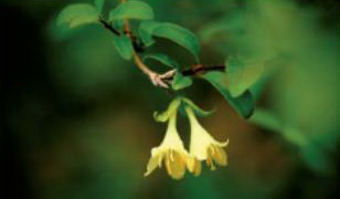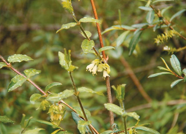 落叶灌木,高0.5-1.5m。幼枝被刚毛、小糙毛及腺毛,老枝灰色,被具基盘刚毛。冬芽具1对有纵槽的鳞片,长卵形,长约1.5cm。叶较厚,椭圆形、卵状长圆形或近圆形,长1.5-6cm,宽0.7-3.6cm,先端钝或急尖,边缘有缘毛,基部楔形或近圆形,两面有刚毛和短糙毛;叶柄短,被刚毛。总花梗长约1.5cm,被刚毛;苞片宽卵形,长至2.5cm,宽至1.5cm,常紫红色,有网脉及刚毛;小苞片缺;双花的萼分离,具刚毛,萼齿不明显;花冠黄色,筒状漏斗形,整齐,长1.5-2cm,外面被刚毛和短毛,冠筒长于裂片,基部具囊,花柱伸出冠筒外,下半部被毛。果红色,圆形或长圆形,长约1cm。花果期6-9月。