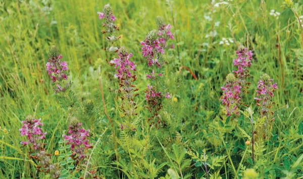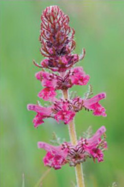 一年或两年生草本,高可达40cm以上。根垂直向下,不变粗。茎常多条自基部发出,中空,草质。基生叶柄达25mm,有密毛,茎叶柄较短,4枚轮生,叶片长圆形,长达3cm,宽14mm,羽状全裂,裂片约10对,披针形。花序长达25cm,花轮极多而均疏距,多者达20余轮;萼下有短梗,膨大呈球形,前方不裂,膜质,主脉明显,有5齿,齿不等,三角形而有锯齿。花冠长约15mm,其管在基部以上向前膝曲,下唇长于盔,裂片圆形,中裂较小,基部狭缩,其两侧与侧裂所组成之缺刻清晰可见,盔长约6mm,镰状弓曲,基部仅稍宽于其他部分,中下部有一最狭部分,额高凸,常有具波状齿的鸡冠状凸起,端的下缘尖锐但无凸出的小尖;花丝1对有毛;柱头略伸出。蒴果斜卵形。花果期6-9月。