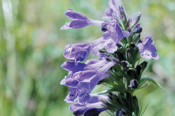 多年生草本,高 40~80cm。根茎长,顶 端有分枝。茎直立,四棱形,不分枝。叶卵状披针形至披 针形,长 4~8cm,宽 1.5~2.6cm ;叶柄短至无柄。轮伞花 序生茎端,初时密集近头状,后疏离;苞叶与茎生叶同形, 较小 ;小苞片线状披针形,长于花萼,边缘具睫毛,两 面被短硬毛和柔毛 ;花萼筒状,长 10~13mm,带蓝紫色, 被短毛,上唇 3 裂,下唇 2 裂,萼齿披针形,先端渐尖 ; 花冠蓝紫色,长 2.2~3cm,外面被短柔毛,冠筒细,略弯曲, 喉部扩展,二唇形,上唇直立,2 深裂,下唇 3 裂 ;雄蕊 略伸出花冠。小坚果 4,倒卵形,长约 2mm,黑褐色,光滑。花果期 7~8 月。