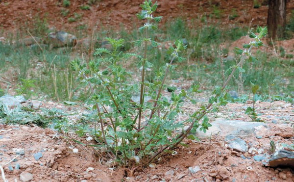 多年生草本,披散于地面或上升,具 圆锥形的主根。茎高15-35cm,四棱形,具沟槽,带紫红色,密被微柔毛,常在基部分枝。叶轮廓为圆形,长1-2cm,宽1.5-2.5cm,先端圆形,基部心形,3深裂,裂片有圆齿或长圆形犬齿,有时叶片为卵圆形,3浅裂或深裂,裂片无齿或有稀疏圆齿,通常基部越冬叶远较宽大,叶片两面均绿色,上面疏生微柔毛,下面沿脉上被长柔毛,余部具腺点,边缘具纤毛,脉掌状,3-5出;叶柄长,基生叶的长2-3cm,上部叶的较短,通常在1cm左右,扁平,上面微具沟槽。小坚果长卵形,长约1.5mm,褐色。花期3-4月,果期5-6月。