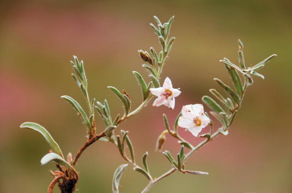 多年生草本,根状茎短,木质化,茎少数或多数,高2-10cm,平卧或上升, 枝和叶密被贴生稀半贴生银灰色绢毛。叶互生,线形或狭披针形,长1-2cm,宽1-4mm,先端锐尖,基部狭,无柄。花单生枝端,具细花梗,长0.5-7cm;萼片5,长4-7mm,外萼片长圆形或长圆状椭圆形,近锐尖或稍渐尖,内萼片较宽,椭圆形,渐尖,密被贴生银色毛;花冠小,漏斗状,长9-15mm,淡玫瑰色或白色带紫色条纹,有毛,5浅裂 ;雄蕊 5,较花冠 短一半,基部稍扩大;雌蕊无毛,较雄蕊稍长,子房2室,每室2胚珠;花柱2裂,柱头2,线形。蒴果球形,2裂,长4-5mm。种子2-3枚,卵圆形,光滑,具喙,淡褐红色。花果期6-9月。