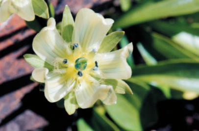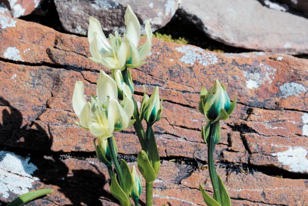 多年生草本,高8-26cm。根茎短。茎直立,近圆形,不分枝,花葶状。叶对生;叶片长圆形或椭圆形,长1.5-6.5cm,宽0.7-2.3cm,先端钝或圆形,基部渐狭成柄,叶柄扁平,长至3cm;茎中上部无叶或具1-2对苞片状叶。聚伞花序或单花顶生;花梗四棱形,长至5cm;花冠黄绿色,深裂,裂片长圆形或椭圆形,长1.5-2cm,先端圆形或钝,全缘或啮蚀状,背部中央蓝色,基部具2个腺窝,腺窝下部囊状,边缘具长柔毛状流苏;花丝线形,花药蓝色,长约3mm;子房无横的皱褶,卵状长圆形。蒴果与花冠等长;种子多数,表面具纵皱褶。花果期8-9月。