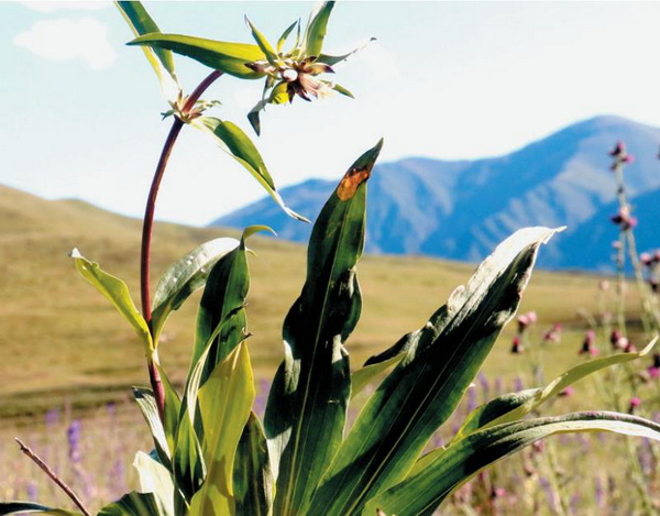 多年生草本,高15-35cm,全株光滑无毛,基部被枯存的纤维状叶鞘包裹。须根数条,粘结成一个较细瘦、圆柱形的根。枝少数丛生,斜升,黄绿色或上部带淡紫红色,近圆形。莲座丛叶披针形或椭圆状披针形,长7-25cm,宽1.5-3.5cm,先端渐尖,基部渐狭,边缘微粗糙,叶脉3-7条;茎生叶披针形,稀卵状披针形,长3-6cm,宽0.5-2cm。花多数,无花梗,簇生枝顶呈头状或腋生作轮状;花萼长为花冠的1/4,萼筒膜质,黄绿色,长4.5-7mm,一侧开裂呈佛焰苞状;花冠黄绿色,具蓝色细条纹或斑点,筒形,长1.5-2cm,裂片卵形或卵圆形,长3-3.5mm,先端钝圆,全缘,褶偏斜,三角形,长1-1.2mm,先端急尖,全缘。蒴果无柄,内藏,狭椭圆形,长13-15mm;种子褐色,有光泽,狭矩圆形,长1.5-1.6mm,表面具细网纹。花果期8-9月。