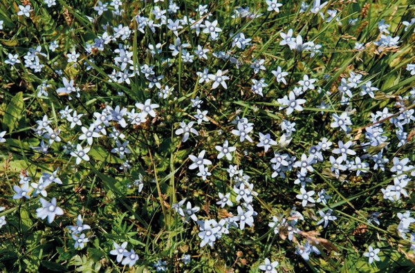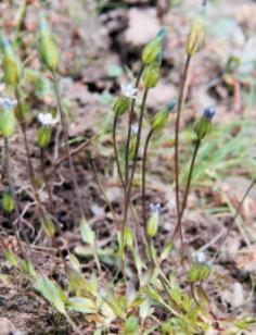 一年生草本,高2-10cm,茎从基部分枝,枝斜生,下部节间短缩,上部伸长,花梗状,四棱形。基生叶匙状长圆形,长3-10mm,宽1.5-2mm,先端钝,基部渐狭成短柄;茎生叶卵状长圆形或椭圆形,稀卵形,长2-12mm,宽至5mm,先端钝,基部楔形,无柄,花5数,单生枝顶,花梗长至7cm;花萼长为花冠的1/2或稍短,深裂,裂片不整齐,卵形、卵状披针形或披针形,宽至4mm,先端急尖,稀渐尖,有时边缘黑色,基部有浅囊,花冠蓝色或上部蓝色,下部黄色,其蓝色脉纹,长5-10mm,果期长达15mm,浅裂至中裂,裂片卵状长圆形,先端钝圆,基部具两束白色副冠,花丝线形,白色,花药黄色。蒴果略长于花冠,种子褐色,花面光滑。花果期8-9月。