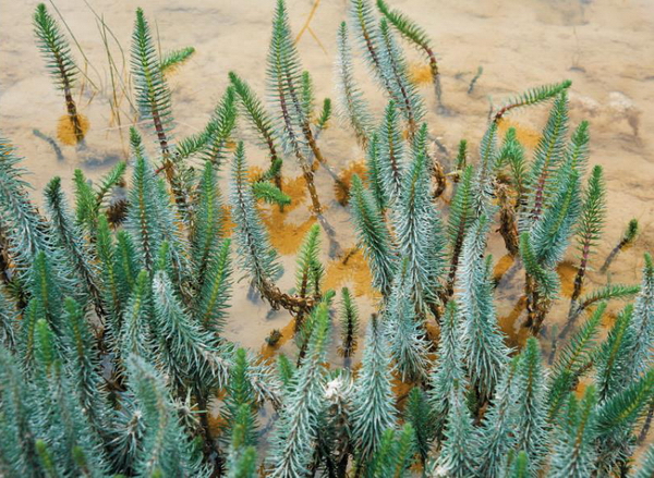 水生草本,高16-60cm。根状茎直径3-9mm,节上生不定根。茎直立,圆柱形,直径4-9mm,不分枝,具纵沟纹,无毛。叶轮生,每轮通常10-12枚,线形,长1.3-3cm,宽1-1.6mm,先端钝,全缘,无毛,具单脉,无柄。花小,两性,稀单性,单生于叶腋;花梗极短,无毛;萼筒浅杯状,长约0.3mm,无毛,包围着雄蕊和花柱下部,无萼齿;无花瓣;雄蕊1,长约1.7mm,花丝线形,花药椭圆形;子房近下位,椭圆形,长约1mm,1 室,花 柱丝状,长约2mm,被柔毛。核果淡紫色,椭圆形,长约1.4mm。花果期6-9月。