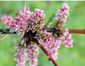 灌木,高0.2-2m,基部多分枝,老枝紫褐色,当年生枝紫红色或黄绿色。叶密生,条状披针形、卵状披针形或矩圆形,长1.2-5mm,宽0.5-2mm,先端钝或尖,基部扩展。总状花序长7-15cm,顶生于当年生枝上,密集成穗状,基部无鳞片;苞片宽卵形,长4.5-6mm,宽3-5mm,先端渐尖或尾状尖,边缘 膜质,常脱落;花梗长约1mm;萼片5,披针形或矩圆形,长3-4mm,宽1-2.5mm,边缘膜质;花瓣5,倒卵形,长4~5mm,宽1.5~2.5mm,先端钝圆,基部狭缩,淡红色或紫红色,宿存;雄蕊 10,花丝由 1/2~2/3 以下合生。蒴果狭圆锥形,长8-10mm。花期6-7月,果期7-9月。