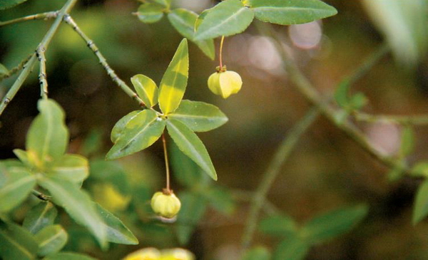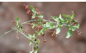 灌木,高1-2m,全株无毛。茎直立,多分枝,小枝具4-5角棱,老时常具木栓质翅。叶对生;叶片卵形或卵状披针形至披针形,长0.8-4cm,宽0.4-1.5cm,先端渐尖,基部宽楔形,边缘具细锯齿。聚伞花序腋生,具1-5花;花深紫色,直径4-5mm;花梗长约5mm;萼片4,小,长约1mm,半圆形;花瓣4,椭圆形,长约2mm;雄蕊着生在花盘上,花丝短;花盘4浅裂,紫褐色;子房平滑,每室仅1枚种子发育,柱头近无柄。蒴果常紫色或粉红色,深4裂,倒心形或倒卵圆形,长4-7mm,宽8-11mm;种子卵形,黑紫色,长约4mm,被橘红色假种皮。花期6-7月,果期7-9月。