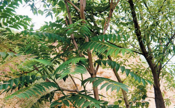 落叶乔木,高可达20m,树皮平滑而有直纹;嫩枝有髓,幼时被黄色或黄褐色柔毛,后脱落。叶为奇数羽状复叶,长40-60cm,叶柄长7-13cm,有小叶13-27;小叶对生或近对生,纸质,卵状披针形,长7-13cm,宽2.5-4cm,先端长渐尖,基部偏斜,截 形或稍圆,两侧各具1或2个粗锯齿,齿背有腺体1个,叶面深绿色,背面灰绿色,柔碎后具臭味。圆锥花序长10-30cm;花淡绿色,花梗长1-2.5mm;萼片5,覆瓦状排列,裂片长0.5-1mm;花瓣5,长2-2.5mm,基部两侧被硬粗毛;雄蕊10,花丝基部密被硬粗毛,雄花中的花丝长于花瓣,雌花中的花丝短于花瓣;花药长圆形,长约1mm;心皮5,花柱粘合,柱头5裂。翅果长椭圆形,长3-4.5cm,宽1-1.2cm;种子位于翅的中间,扁圆形。花期6-7月,果期9-10月。