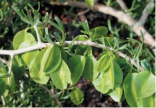 灌木,高0.5-1.5m。枝开展,顶端刺状,皮灰白色,木质部黄色,无毛。叶在老枝上簇生,幼枝上对生,叶柄细,长8-16mm,无毛,小叶1对,肉质,条状倒卵形或长匙形,长8-20mm,宽2-5mm。花单生于叶腋;花梗长约8mm;萼片4,绿色,长4-6mm;花瓣黄白色,倒卵形,长约10mm,先端钝圆,向基部渐狭成爪;雄蕊长于花瓣,花丝基部有鳞片状附属物,附属物披针形,长约4mm;子房3室。蒴果近球形,长15-30mm,有3宽翅(翅宽4-9mm),通常3室,每室含种子1枚;种子肾形,褐色,长6-8mm,表面密被颗粒状突起。花期5-6月,果期7-8月。