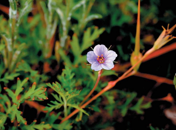多年生草本,高30-50cm。根茎直生,粗壮。茎直立,单生,具棱槽。叶基生和茎生叶对生;托叶卵状三角形或上部为狭披针形,长5-8mm,宽1-3mm,基生叶和茎下部叶具长柄;基生叶片圆肾形,长3-5cm,宽4-9cm,5深裂达2/3处,裂片倒卵状楔形,下部全缘,上部不规则状齿裂,茎生叶3裂至3/5处,裂片长卵形或宽楔形,上部齿状浅裂,先端长渐尖,表面被短伏毛,背面沿脉被短糙毛。花序腋生和顶生,总花梗被倒向短柔毛, 每梗具2花;苞片钻形,长3-4mm;花梗与总花梗相似,长为花的2-4倍;萼片长卵形或卵状椭圆形,长5-6mm,宽2-3mm,先端具细尖头;花瓣白色或淡红色,倒卵形,与萼片近等长,内面基部被疏柔毛;雄蕊稍短于萼片,花丝淡棕色,下部扩展,被缘毛;雌蕊被短糙状毛,花柱分枝紫红色。蒴果长约2cm,被短柔毛和长糙毛。花期6-8月,果期8-9月。
