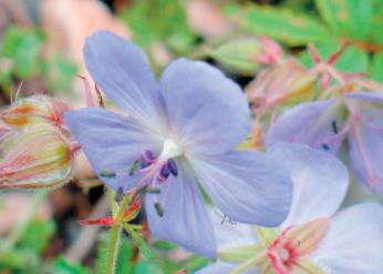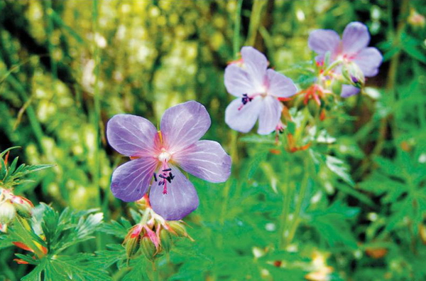 多年生草本,高 50-80cm。根茎 粗短,根肉质,多数簇生。茎直立,具白柔毛,上 部分枝较多,枝上密被开展的黑腺毛。基生叶肾 圆形,长2-6cm,宽2-7cm,常5-7掌状深裂,裂片条形,羽状浅裂;基生叶和茎下部叶柄较长,10-20cm,向上渐短,顶端近于无柄;托叶披针形,长0.7-1.2cm,褐色或黄绿色。聚伞花序生于小枝顶端;柄长2-5cm,生2花,花柄长1-2cm,果期弯曲,皆具短柔毛及开展腺毛;花瓣蓝紫色,倒卵形,顶端圆形,比萼片长1倍,基部有毛;花丝基部扩大部分具长毛,花柱长7mm,柱头分枝长2mm。蒴果长约3cm,具鸟 嘴状长喙,被短柔毛并混有开展腺毛。花果期6-8月。