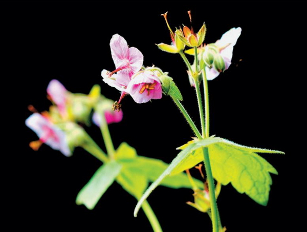 多年生草本,高30-80cm。根状茎粗短。茎直立,向上分枝,有倒生白毛叶互生,肾状五角形,直径5-10cm,掌状5中裂或略深,裂片菱状卵形,宽3-5cm,边缘有羽状缺刻或粗牙齿,上面有长伏毛,下面脉上疏生长柔毛;基生叶有长柄,长2-3倍于叶片,密生长硬毛,茎生叶具柄短,顶部的无柄;托叶离生,长三角形,膜质。聚伞花序顶生,花序柄2-3枚,出自1对叶状苞片腋间,顶端各有2-4花;花柄长约1.5cm,密被腺毛,在果期直立;萼片5,卵状椭圆形,长约1cm,有密腺毛;花瓣5,淡蓝紫色,长约1.5cm;雄蕊10。蒴果长约3cm,有微毛。花期7-8月,果期8-9月。