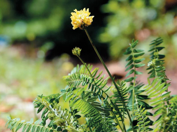 多年生草本,高10-35cm。茎直立,丛生,较细弱,基部分枝,疏被白色和黑色柔毛。托叶卵状披针形,疏被毛,彼此联合至中部,抱茎;奇数羽状复叶,长6-12cm,小叶13-27,卵状披针形,长6-22mm,宽2-5mm,先端渐尖,基部圆形,两面疏被白色平伏长柔毛。总状花序腋生,密集多花,呈头状;总花梗长8-22cm,疏被柔毛,苞片条状披针形,长4-10mm,疏被长柔毛,花萼筒状,长7-10mm,密被黑色和白色相间的短柔毛,萼齿等长于萼筒或稍短;花冠黄色;旗瓣长约13mm,瓣片宽卵形,先端微凹,基部具爪;翼瓣长约12mm,爪长5mm;龙骨瓣长约8mm,爪长4.5mm耳短,具短喙;子房被毛。荚果长椭圆形或卵状矩圆形,长10-14mm,宽4-5mm,膨胀,密被毛;种子肾形,褐色,长约2mm。花期6-8月,果期8-9月。