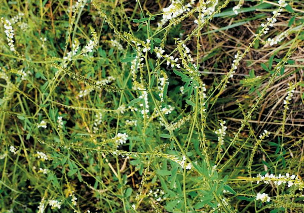 一、二年生草本,高70-200cm。茎直立,圆柱形,中空,多分枝。羽状三出复叶,小叶长圆形或倒披针状长圆形,长15-30cm,宽6-12mm,先端钝圆,基部楔形,边缘疏生浅锯齿。总状花序长9--20cm,腋生,具花40-100朵,排列疏松;苞片线形,长1.5-2mm;花长4-5mm;花梗短,长1-1.5mm;萼钟形,长约2.5mm,微被柔毛,萼齿三角状披针形,短于萼筒;花冠白色,旗瓣椭圆形,稍长于翼瓣,龙骨瓣与冀瓣等长或稍短;子房卵状披针形,上部渐窄至花柱,无毛,胚珠3-4粒。荚果椭圆形至长圆形,长3-3.5mm,先端锐尖,具尖喙,表面脉纹细,网状,棕褐色,老熟后变黑褐色;有种子1-2粒。种子卵形,棕色,表面具细瘤点。花期5-7月,果期7-9月。