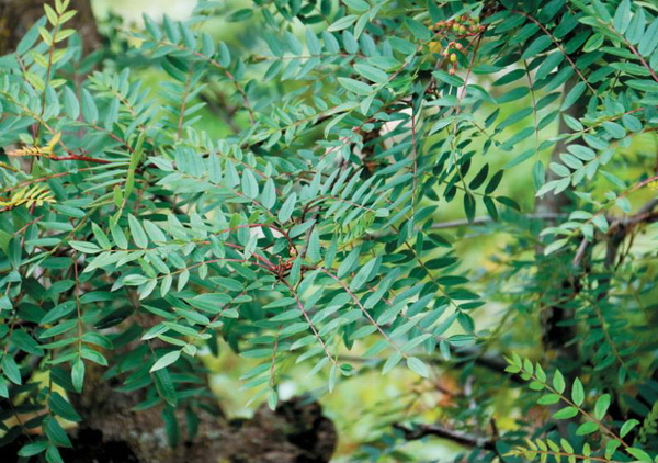 乔木,高5-10m。小枝圆柱形,暗灰褐色,具少数皮孔,幼时微被白色绒毛。奇数羽状复叶,连柄共长10-15cm,小叶片4-8对,长圆披针形或卵状披针形,长3-5cm,宽1-8cm,先端急尖、圆钝或短渐尖,边缘有尖锐锯齿,上面无毛,下面沿中脉有白色绒毛,逐渐脱落无毛。复伞房花序具多数花朵,总花梗和花梗无毛或被稀疏白色柔毛,花梗长3-5mm;萼筒钟状,外面无毛,内面几无毛;萼片三角形,先端急尖,外面无毛,内面近先端微具柔毛;花瓣卵形,长3-4,宽约3mm,先端圆钝,白色;雄蕊20,长约为花瓣的1/3;花柱4-5,基部有灰白色柔毛。果实球形,直径5-8mm,白色,有时带粉红晕。花期5-7月,果期8-9月。