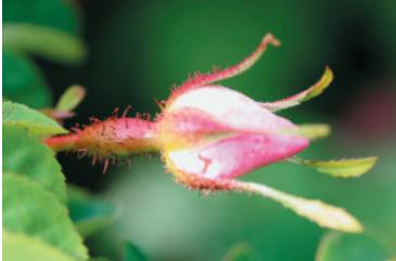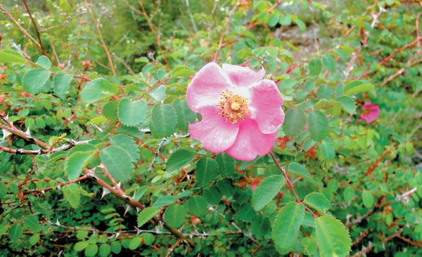灌木,高3-5m;小枝圆柱形, 无毛或有稀疏短柔毛,有直立或稍弯曲、基部膨大而扁平皮刺,有时老枝常混有针刺。小叶7-11,连叶柄长6-10cm,小叶片椭圆形至卵状长圆形,长2-5cm,宽8-20mm,先端急尖稀圆钝,基部近圆形或宽楔形,边缘有重锯齿,上面无毛,下面有柔毛或至少沿脉有柔毛,中脉和侧脉均突起;托叶大部贴生于叶柄,离生部分卵状披针形。花单生,或2-3朵簇生,苞片1-2,卵状披针形,先端尾尖;萼片卵状披针形,先端浅裂扩展成叶状,或有时羽状分裂,外面近无毛;花瓣粉红色,宽倒卵形,先端微凹,基部宽楔形;花柱离生。密被柔毛,比雄蕊短很多。果长圆形或倒卵状长圆形,先端有短颈,长1.5-2.5cm,宽1-1.7cm,紫红色,外面常有腺毛。花果期6-9月。