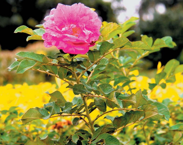 灌木,高达2m。茎粗壮,直立,丛生;小枝密生短绒毛、腺毛和针刺,有直立或弯曲、淡黄色的皮刺,皮刺外被短绒毛。奇数羽状复叶具小叶5-9,长5-22cm,小叶较厚,椭圆形至椭圆状倒卵形,长1.5-5cm,宽1-2cm,先端钝圆或急尖,基部宽楔形或圆形,边缘具细锯齿;顶生小叶具叶柄,侧生小叶具短柄或近无柄,叶柄和叶轴密被绒毛和腺毛;托叶离生部分卵形,边缘锯齿具腺。花单生或3-6簇生;苞片卵形;花梗8-25mm,密被绒毛、腺毛和刺毛;萼片卵状披针形,长2-4cm,先端尾尖,常扩展成叶状,腹面被柔毛,背面密被柔毛和腺毛;花瓣倒卵形,半重瓣或重瓣,紫红色至白色;花柱被柔毛。果扁球形,长2-2.5cm,砖红色,肉质,平滑。花期6-7月,果期8-9月。