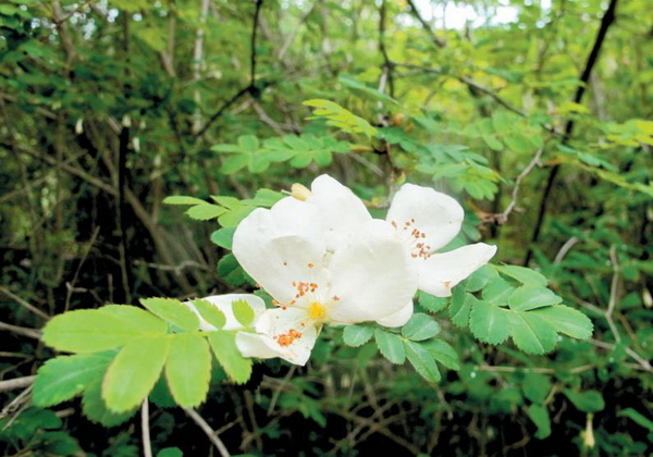 直立灌木,高0.5--2m。小枝紫红色,具扁而基部膨大的皮刺或无,新枝生针刺或无。奇数羽状复叶具小叶9-17,长3-10cm,小叶长圆形或椭圆状长圆形,长8-28mm,宽5-10mm,先端钝圆或急尖,基部宽楔形,边缘具锐锯齿,无毛或仅背面沿中脉被柔毛。花单生于叶腋,直2.5-3.5cm,无苞片,花梗长1-2cm,无毛,萼片4,三角状披针形,全缘,先端渐尖,背面近无毛,腹面有稀疏柔毛;花瓣4,白色,倒三角状卵形,先端微凹,基部宽楔形,雄蕊多数;花柱离生,密被柔毛,微伸出花托口,甚短于雄蕊。果圆形或倒卵球形,鲜红色,长8-15mm,成熟时果梗肉质肥大,橙黄色,宿存萼片直立。花期5-7月,果期7-9月。