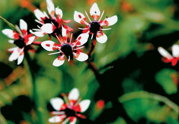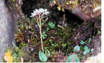 多年生草本,高3.5-19cm。叶均基生,具柄,叶片卵形至长椭圆形,长0.8-3.5cm,宽0.7-1.9cm,先端急尖或稍钝,边缘具圆齿状锯齿和腺睫毛,基部楔形,稀心形,两面疏生柔毛或无毛。花葶被卷曲腺柔毛;苞叶卵形、椭圆形至长椭圆形,长5-15mm。聚伞花序伞房状,长1.5-8cm,具2-17花,稀单花;萼片在花期开展至反曲,三角状卵形至狭卵形,长2-6mm,宽1-3mm,先端钝或渐尖,无毛或疏生柔毛,3-8脉于先端汇合;花瓣白色,稀红色,基部具2黄色斑点,阔卵形至椭圆形,长3-6.1mm,宽2.1-5mm,先端钝或微凹,具短爪;花盘环形,2心皮黑紫色,子房阔卵球形。花果期7-9月。