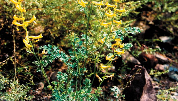 多年生草本,高30-50cm,全株灰绿色。根粗壮,稍木质化。茎坚硬,木质化,多分枝。基生叶多数,与茎下部的叶均具长柄,上部的叶较小,具短柄;叶片灰绿色,并或多或少均被白粉,肉质,轮廓为狭卵形,长3-10cm,三回羽状全裂,一回裂片具短柄,末回小裂片狭倒卵形或狭卵形,顶端钝,并具短尖。总状花序,长5-20cm,具多花,稀疏,苞片披针形或钻形,长2-8mm;萼片卵形或卵圆形,长2-4mm,边缘齿裂;花黄色,长1-1.5cm,花瓣4,二轮,外轮二片较大,顶端褐色,呈兜状下凹,具短尖头,距末端常弯曲呈钩状;子房狭倒披针形,花柱细长,柱头扁圆形,具4圆裂。蒴果长柱状,长1.5-2.5cm,由基部向上开裂;种子圆珠形,黑色,具光泽。花果期6-8月。